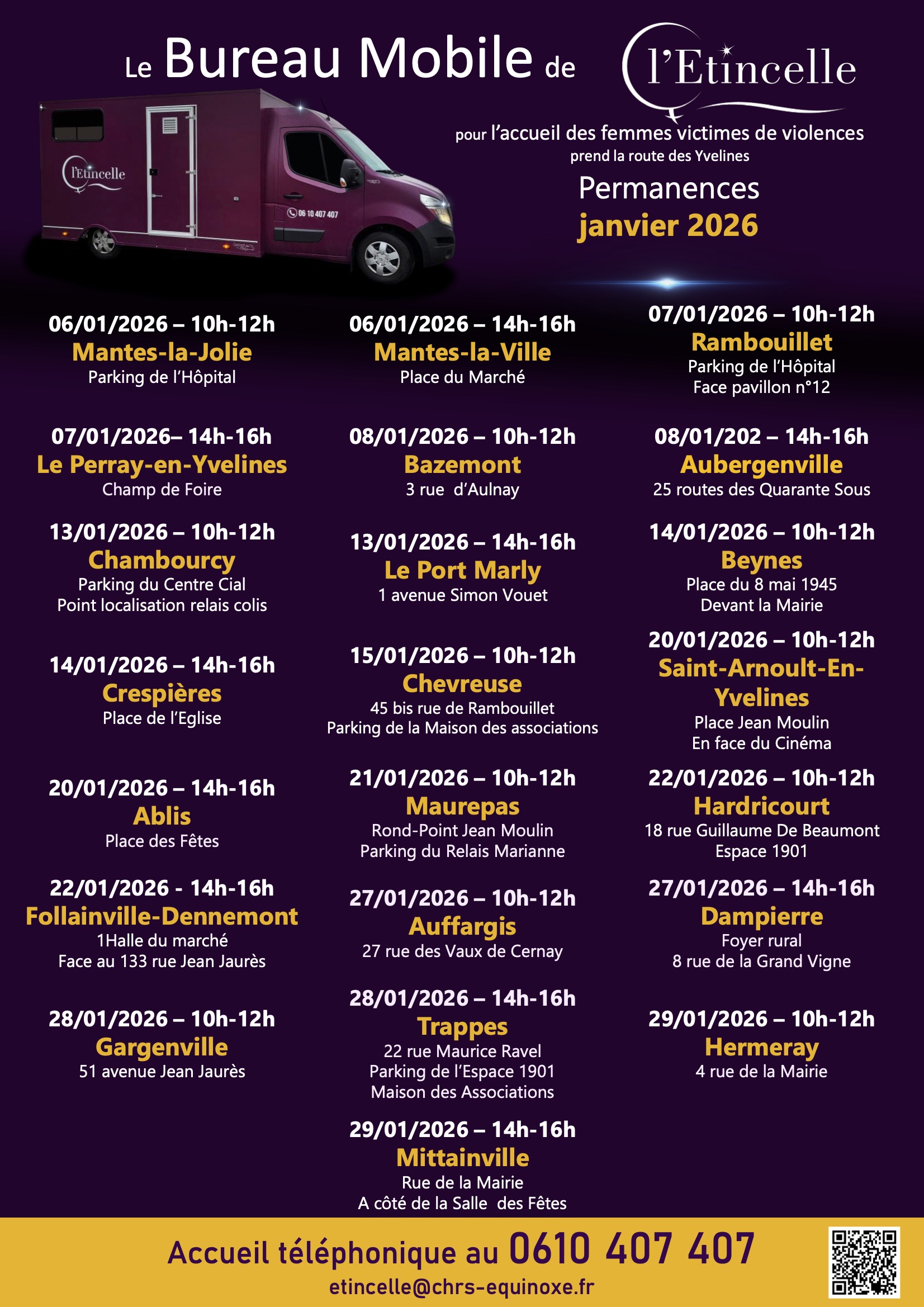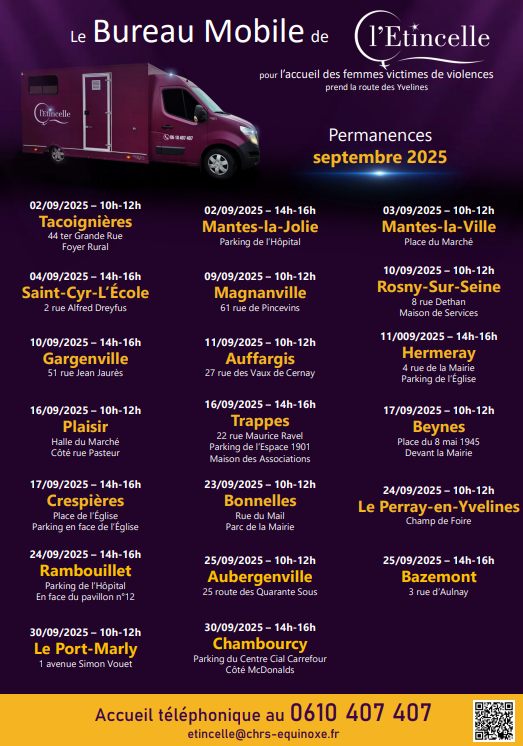 La ville d'Aubergenville accueillera le bus Étincelle, un dispositif itinérant dédié à l'accompagnement et au soutien des femmes victimes de violences, le 25 septembre de 10h à 12h, sur le parking de la Maison des Associations - 25 route de 40 sous à Aubergenville