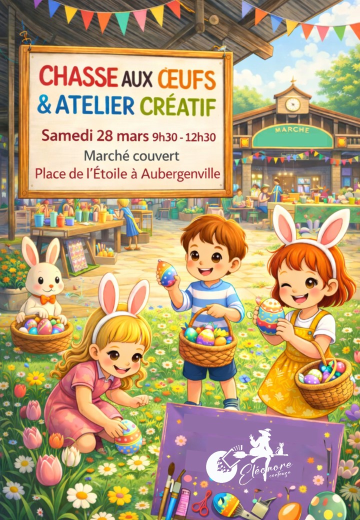Chasse aux oeufs et ateliers créatifs le samedi 28 mars de 9h30 à 12h30 au Marché Couvert par Éléonore Regien, conteuse.