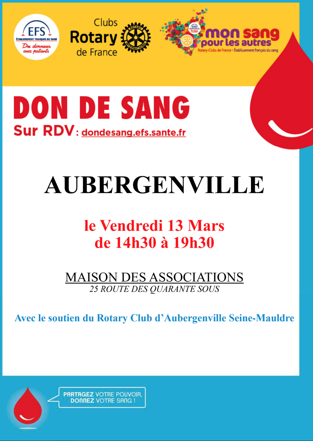 Nous vous invitons à participer à la prochaine collecte de sang le vendredi 13 mars de 14h30 à 19h30 à la Maison des Associations