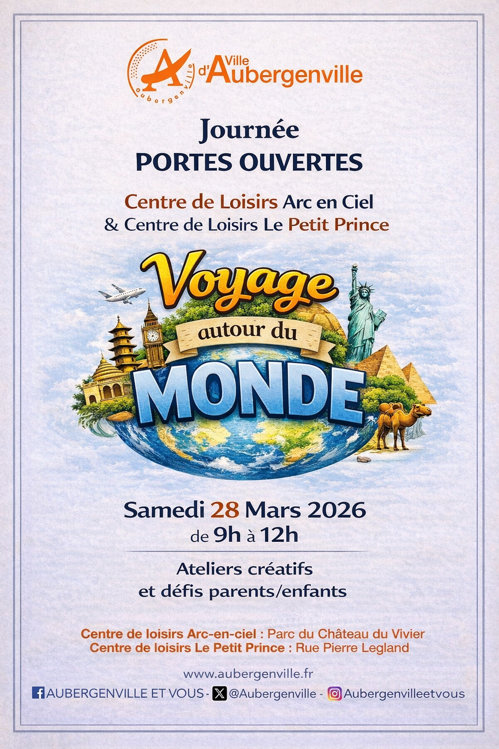 Le samedi 28 mars 2026, les accueils de loisirs d'Aubergenville vous ouvrent grand leurs portes ! Parents et enfants, préparez vos passeports pour une matinée d'évasion et de découverte placée sous le signe de l'exploration internationale.