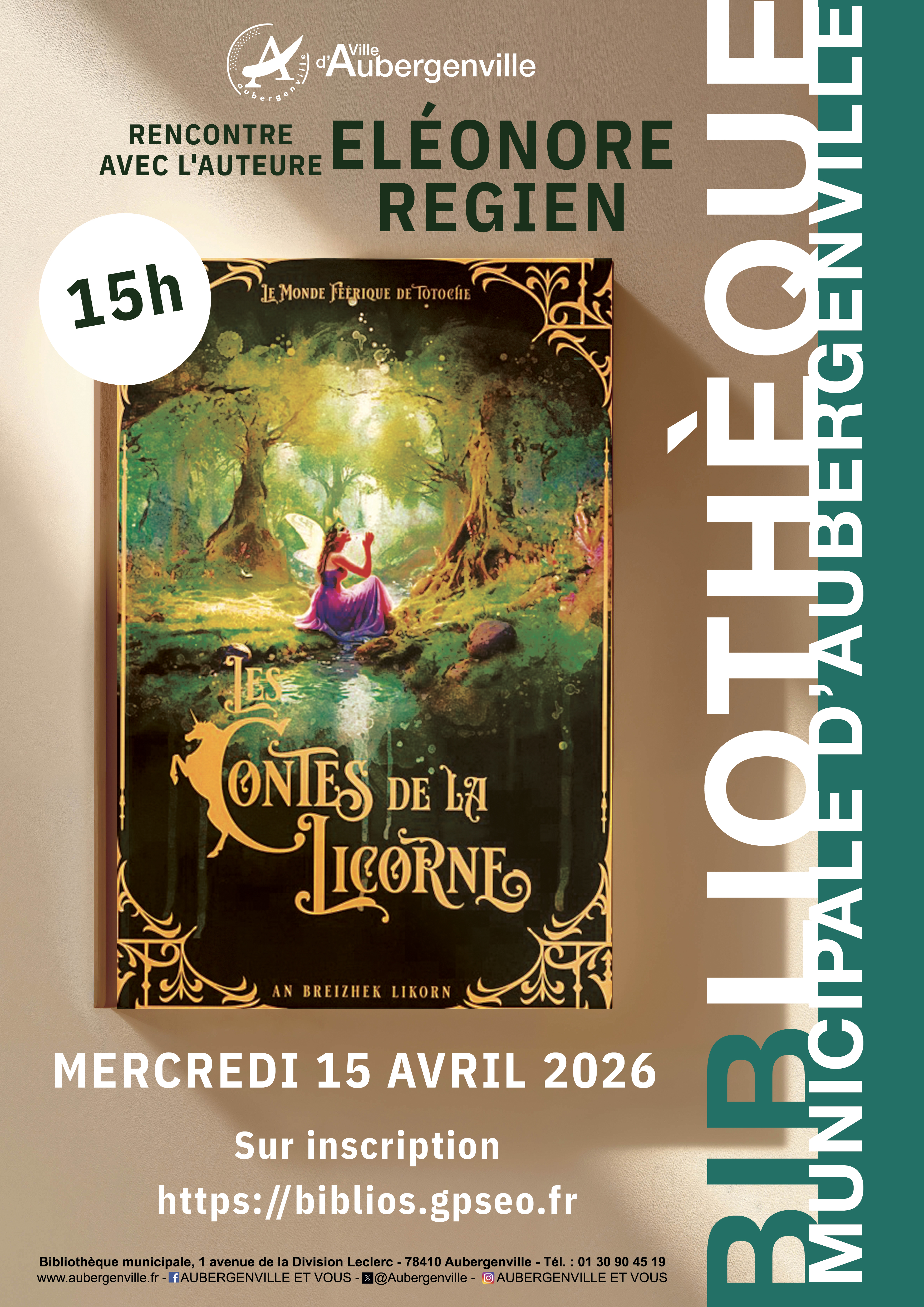 La Bibliothèque Municipale d'Aubergenville a le plaisir de vous inviter à une rencontre avec l'auteure Éléonore Regien, à l'occasion de la sortie de son ouvrage "Les Contes de la Licorne".